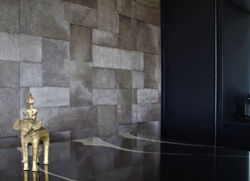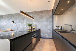 Door het materiaalgebruik zoals een marmeren keukenblad, visgraat vloer, behang, kreeg het gehele appartement een stoere, luxe uitstraling, in de sfeer van een "mancave".